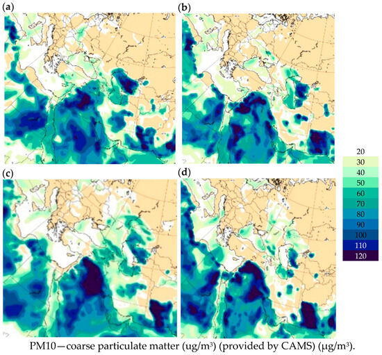 CAMS forecasts of PM10 using the Western Asia option at 06:00 UTC on 29 May 2024—(a); at 18:00 UTC on 29 May 2024—(b); at 06:00 UTC on 31 May 2024—(c); and at 18:00 UTC on 31 May 2024—(d).