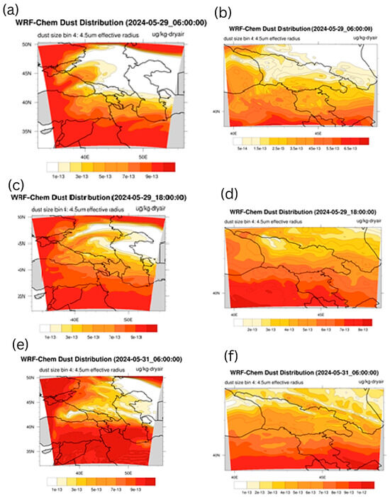 Results of numerical calculations of the WRF-Chem v.4.5.1 model, performed in a coarse domain with a resolution of 19.8 km, at 06:00 UTC on 29 May 2024—(a); at 18:00 UTC on 29 May 2024—(c); at 06:00 UTC on 31 May 2024—(e); and in a fine mesh grid with a resolution of 6.6 km, at 06:00 UTC on 29 May 2024—(b); at 18:00 UTC on 29 May 2024—(d); at 06:00 UTC on 31 May 2024—(f).