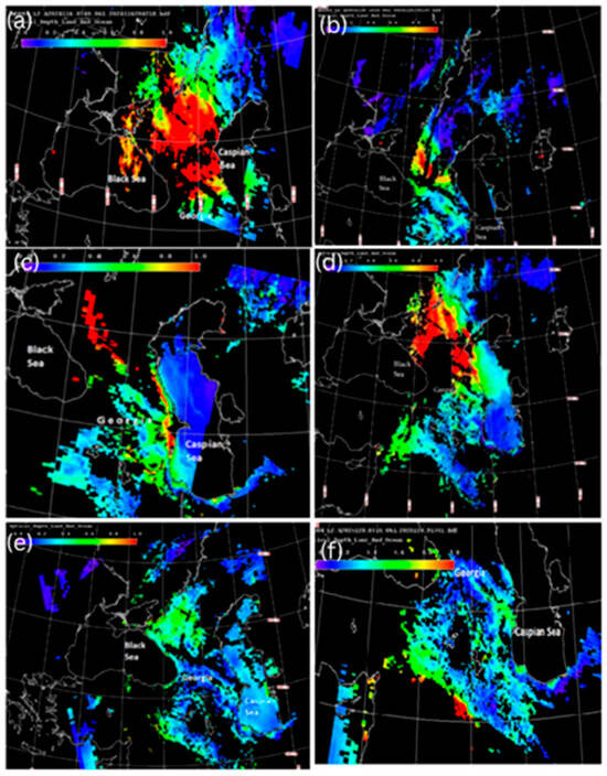 Figure 8a shows that a wide aerosol band extended from the eastern coast of the Caspian Sea towards the Black Sea, which intensified in the western direction (over the territory of Georgia), and the maximum AOD values were observed in the northeastern part of the Black Sea at 07:40 on 25 April 2024. Figure 8a also shows that strong dust clouds were observed in the northern and northwestern directions of the Main Caucasus Range over the territory of Russia. Figure 8b shows that after 2 h and 35 min, strong dust clouds stretched between the Black and Caspian Seas, and a weak dust band completely covered the territory of Georgia. Figure 8c, which corresponds to 06:45 on 26 April 2024, shows that the above aerosol band has shifted slightly to the north, but the AOD distribution over the territory of Georgia has remained almost the same. Figure 8d, which presents the AOD distribution at 07:25 on 27 April 2024, shows that the aerosol intensity has increased at the easternmost coast of the Black Sea, namely in Batumi, while it has remained almost unchanged over the rest of Georgia. Figure 8e, obtained at 10:50 on 28 April 2024, shows that the aerosol intensity has increased at the easternmost coast of the Black Sea, namely in Batumi, but the overall aerosol distribution over the territory of Georgia has remained almost unchanged. Figure 8f, collected at 07:10 on 29 April 2024, shows that a new large aerosol cloud has appeared in southern Georgia, increasing the aerosol impact on the easternmost part of Georgia.