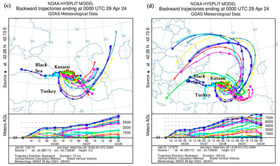 Distribution of mineral dust calculated by the Backward Ensemble trajectory of the HYSPLIT model at different atmospheric heights over the territory of Georgia ((a,c)—from 29 to 26 April 2024; (b,d)—from 29 to 24 April 2024).