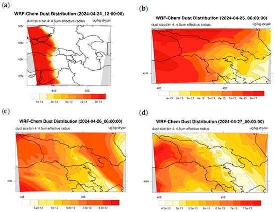 Results of the numerical calculations of the WRF-Chem v.4.5.1 model, performed in a coarse domain with a resolution of 19.8 km, at 12:00 UTC on 24 April 2024—(a); and in a fine-resolution grid with a resolution of 6.6 km, at 06:00 UTC on 25 April 2024—(b); at 06:00 UTC on 26 April 2024—(c); and at 00:00 on 27 April 2024—(d).