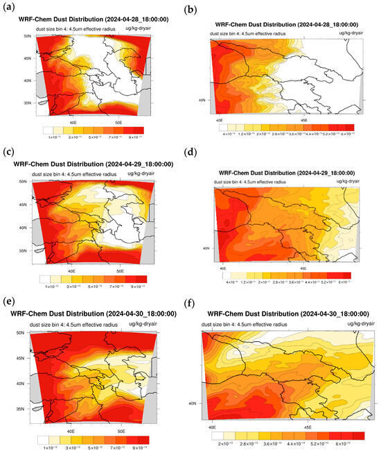 Results of the numerical calculations of the WRF-Chem v.4.5.1 model, performed in a coarse domain with a resolution of 19.8 km, at 18:00 on 28 April 2024—(a); at 18:00 on 29 April 2024—(c); at 18:00 on 30 April 2024—(e); and in a fine-resolution grid with a resolution of 6.6 km, at 18:00 on 28 April 2024—(b); at 18:00 on 29 April 2024—(d); at 18:00 on 30 April 2024—(f).