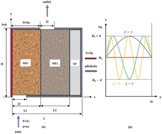 In the present study, the characteristics of metal foam, such as permeability, interfacial area density (), interfacial heat transfer coefficient (), and other parameters, can be found in refs. [46,47,48,49]. Additionally, subscript refers to the metal foam layer. When , it denotes the first layers, which extend through the distance , and when , it signifies the second layer that spreads the distance . Also, is the fluid-phase temperature, is the solid-phase temperature, and and are the solid- and fluid-phase thermal conductivity.