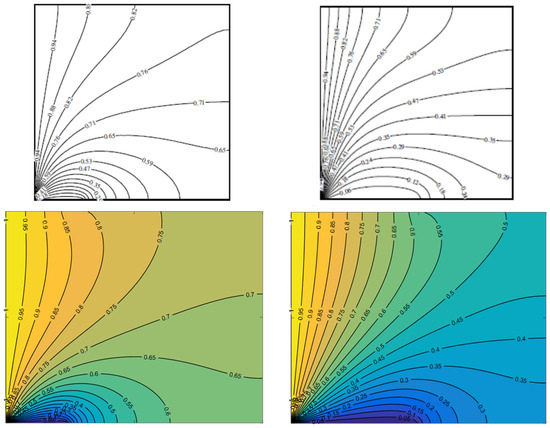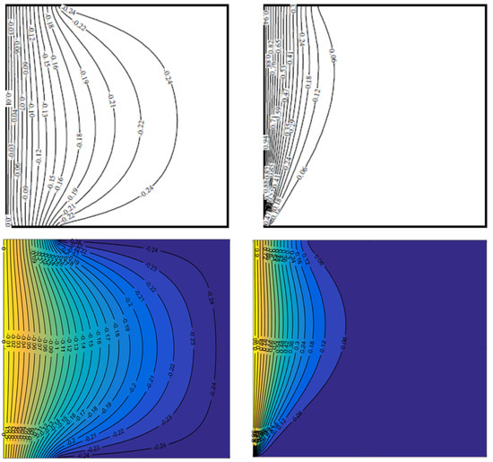 Furthermore, a second validation was accomplished for , , and two different values of and . Isotherms obtained from the present study and introduced in their study are presented in Figure 3. From both confirmations, it is evident that the present computer code can imitate the published numerical results with a high degree of accuracy. Also, it is possible to see the excellent qualitative and quantitative agreement between the results, which provides evidence for the ability of the present code to analyze the proposed study.