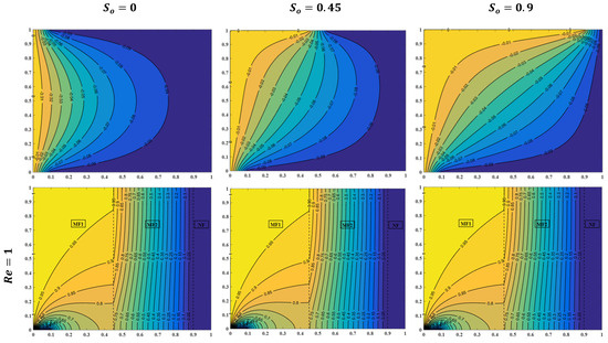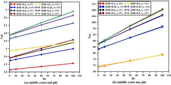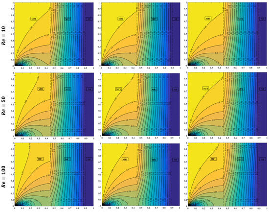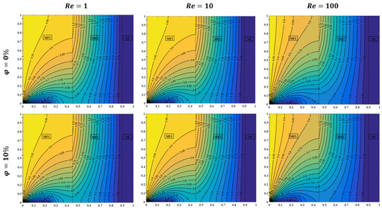 The influences of the Reynolds number and solid copper nanoparticle volume fractions for the uniform heating left sidewall case on the streamlines and isotherm contour lines have been plotted for , , and , as illustrated in Figure 5. For certain Reynolds number values, an increasing nanoparticle fraction effectuates an increase in the fluid temperature for both layers of metal foam. This increase is because of the enhanced water–copper nanofluid’s effective thermal properties, specifically the thermal conductivity, which is mainly responsible for transferring heat inside the enclosure. Therefore, a nanoparticle volume fraction of is a reliant value of fraction for the remaining case results in the present study. Moreover, Figure 5 clearly depicts a reduction in the fluid temperature as the Reynolds number is increased at certain points in the cavity. For , isotherms are controlled almost by conduction and natural convection, and, hence, a larger area is occupied by higher temperature, which makes it suitable for heating applications. When , forced convection currents take place, but, still, they are not large enough to decrease the high-temperature area inside the enclosure. As is further increased to , the effect of forced convection becomes more evident and a clear decrease in temperature at a certain location, as compared with the last two values of the Reynolds number. This temperature reduction makes more appropriate for cooling requests.