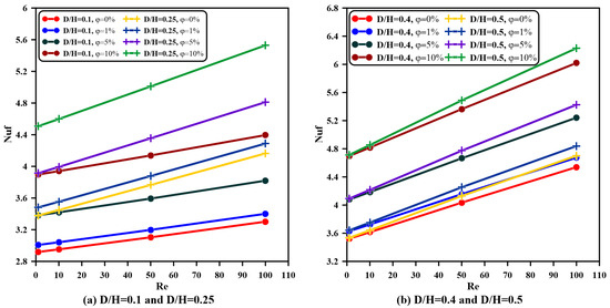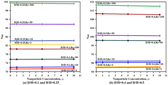 Solid-phase Nusselt number variations with Reynolds number for various values of inlet-to-outlet aspect ratio and nanoparticle fraction at and .