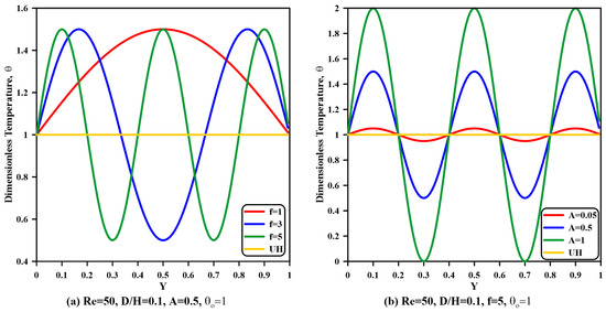 The temperature distribution for non-unform heating along the left cavity wall is displayed in Figure 8 for different values of frequency and amplitude at certain offset temperatures. It is seen from this figure that temperature fluctuates around the offset temperature , which is taken as the uniform heating temperature. This fluctuation gives an indication of heating and cooling on the hot wall as a simulation for practical applications, like the cooling of electronic devices, equipment, nuclear waste management, chemical reactors, and chemical equipment.