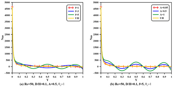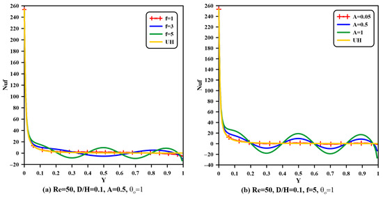 From this point of view, accordingly, the local Nusselt number for the fluid and solid phases is sinusoidally fluctuated along the hot sidewall for the non-uniform case, as demonstrated in Figure 10 and Figure 11. Examining these two figures, it can be deduced that both the fluid and solid local Nusselt number behavior of non-uniform heating with and is similar to their comportment for uniform heating. This similar trend occurs due to the insignificant fluctuation change in the temperature gradient near the wall for these two values of frequency and amplitude and the constant uniform heating case. Also, it is well known that the Nusselt number is altered mainly by the temperature gradient, which is obviously shown for larger amplitude ( and ) and frequency ( and ) values that give a sinusoidal action for the local Nusselt number. By referring to Figure 9, it is clearly shown that there is a temperature gradient fluctuation near the hot wall, which, accordingly, results in local Nusselt number fluctuation, as stated in Equations (32) and (33). Additionally, the sinusoidal fluctuation in the temperature gradient produces some positional locations with a higher temperature gradient relative to other positions in sinusoidal behavior when frequency and amplitude are increased to higher values.