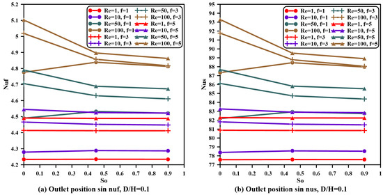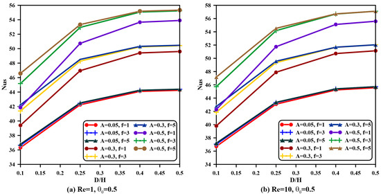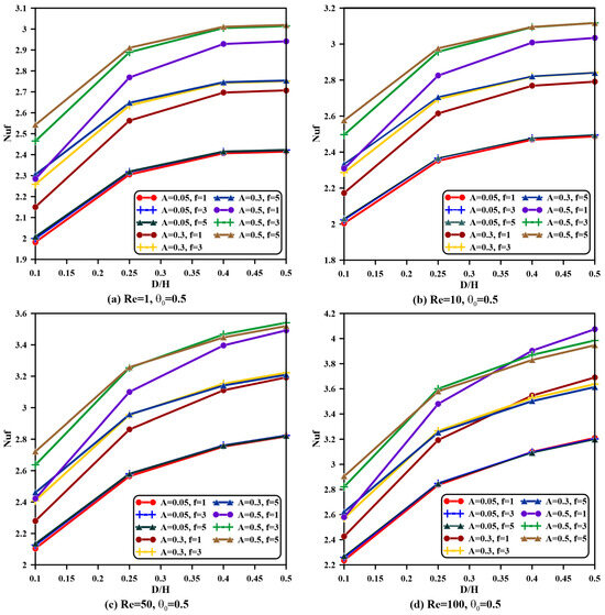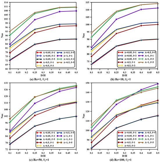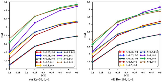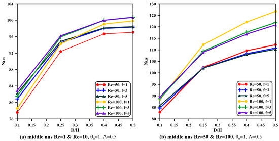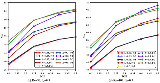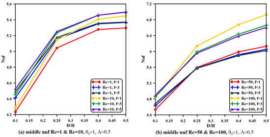 - For all values of the Reynolds number and aspect ratios, both phases’ average Nusselt numbers are magnified once the amplitude is increased and frequency is raised, specifically when and . However, the Nusselt number remains constant when the frequency is raised from to , specifically when the vent aspect ratio is greater than .