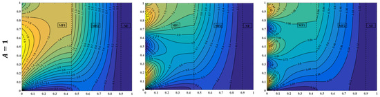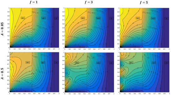 When the sinusoidal offset temperature is increased to , the same performance is achieved for fluid temperature contours, as clarified in Figure 14 at , , , and . At a small value of amplitude (), fluid isotherm lines remain unchanged once the frequency is enlarged. But, as the amplitude is improved to and then to , isothermal lines near the sidewall are also formed sinusoidally when the frequency is amplified but with higher values because an increasing offset temperature leads to higher energy supplied during non-uniform heating. Generally, the isotherm’s sinusoidal shape behavior can be attributed to the same physical reasons mentioned for Figure 9.