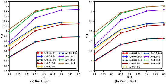 In Figure 15 and Figure 16, metal foam’s fluid- and solid-phase average Nusselt number variations with the vent aspect ratio, Reynolds number, frequency, and amplitude are demonstrated for . Examining these two figures, it can be deduced that average Nusselt number actions are similar to those represented in Figure 12 and Figure 13 for the identical physical explanations mentioned before. For the case of , , and , the fluid-phase Nusselt number is improved by as is raised from to , and also, the solid-phase Nusselt number develops by the same percentage value but with higher values of Nusselt number and temperature. In addition, both metal foam phase Nusselt numbers amplify by for the case of , , and when the Reynolds number enlarges from to but with higher temperature and average Nusselt number values. Therefore, the offset temperature can be settled corresponding to the application’s demand.