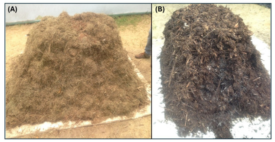 To obtain the substrates used in this work, BM and CO (Figure 1), two semi-static piles of organic waste with a mass of 357.2 kg were formed. Both piles (one for the biodrying process and the other for composting) had the same composition: 56% orange (Citrus spp.) peel, 24.9% mulch (shredded lignocellulosic waste), and 19.1% garden pruning waste. At the beginning, the dimensions of semi-static piles were 1.40 m wide, 1.85 m long, and 0.90 m high.