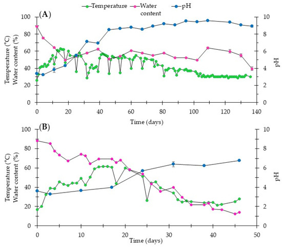 Behavior of temperature, water content, and pH during (A) Composting and (B) Biodrying processes.