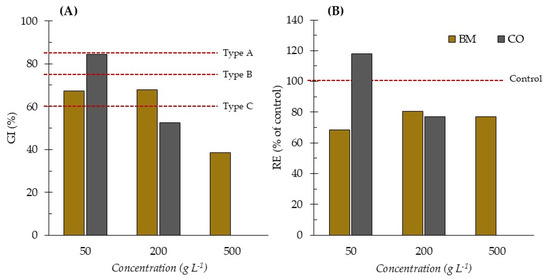 The environmental standard NADF-020-AMBT-2011 [25] proposes the germination index (GI%) as an indicator of the phytotoxicity of compost and relates it to the three different qualities of compost (Type A: GI ≥ 85%, Type B: GI ≥ 75% and Type C: GI ≥ 60%). At the concentration proposed by this standard (200 g L−1), the GI% in the aqueous extract of BM was higher than that of CO, which allows BM to be classified as a substrate like type C compost but leaves CO outside the classification ranges (60–85%) (Figure 3A). In other words, CO is more phytotoxic than BM. However, considering root vigor (measured through the RE% parameter) at the same concentration, good vigor was obtained in both BM (80.5%) and CO (77.1%), compared to the control (100%) (Figure 3B).
