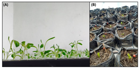Lettuce plants during (A) germination in seedbeds, and (B) growth in substrates.