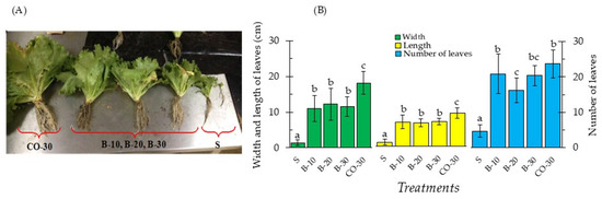 (A) Lettuce grown in the treatments used. (B) The width, length, and number of leaves of the lettuce in each treatment. Arithmetic mean of width, length, and number of leaves of lettuce plants grown in treatments B-10, B-20, B-30, CO-30, and S. Different letters show significant differences among treatments (p ≤ 0.05) (n = 10).