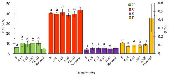 Macronutrient content in the plants of each treatment. Arithmetic mean of N, C, K, and P content in lettuce plants grown in treatments B-10, B-20, and B-30, CO-30, and S, compared to the proposed standard for C [32] and for N, P, and K [33]. Same letters show no significant differences among treatments. (p ≤ 0.05) (n = 10).