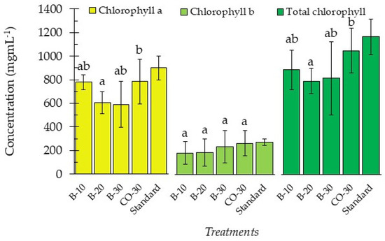 Chlorophyll content in BM and CO treatment plants. Arithmetic mean of the content of chlorophyll a, b, and total in lettuce plants grown in treatments B-10, B-20, B-30, and CO-30, compared to the standard proposed by Da Silva et al. [41]. Different letters show significant differences among treatments. (p ≤ 0.05) (n = 10).