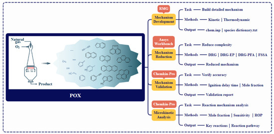 This work established an efficient framework for modeling and optimization of POX of natural gas processes through the proposed HI-Mechanism. The comprehensive mechanism contained 1112 species and 106,877 reactions, providing complete C1-C16 coverage including light hydrocarbon oxidation and PAHs formation pathways. Product-directed simplification via Ansys Workbench yielded an optimized mechanism (397 species, 5135 reactions) balancing computational efficiency and accuracy. Experimental validation confirmed the accuracy of the HI-Mechanism in predicting shock tube ignition delays and major species concentrations. Chemkin-Pro microkinetic analyses enabled pathway quantification through production rates, key reaction identification via sensitivity analysis, and complete CH4-to-PAHs transformation mapping with temperature dependence.