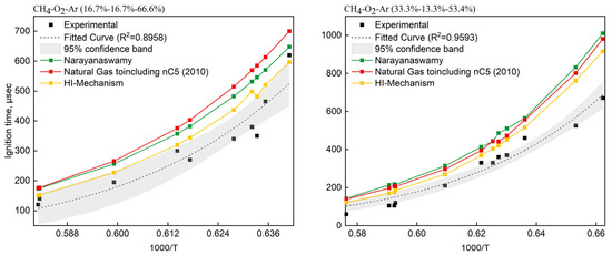Two CH4/O2/Ar mixtures from Seery et al. [62] were selected: (i) 16.7% CH4—16.7% O2—66.6% Ar (O2/CH4 molar ratio = 1.0, 13.4 mol/m3) and (ii) 33% CH4—13% O2—54% Ar (O2/CH4 molar ratio = 0.4, 29.1 mol/m3). The HI-Mechanism was validated against Narayanaswamy [24] and NG-nC5(2010) [17,19,63,64] as reference mechanisms. Figure 5 presents the temperature-dependent ignition delays, comparing experimental data (scatter points ±95% CI) with simulated results from three mechanisms. Comparisons revealed systematic overprediction of ignition delays by all three mechanisms (HI-Mechanism, Narayanaswamy [24], NG-nC5(2010) [17,19,63,64]) versus experimental data. Through systematic comparative studies and literature validation, we attribute the overestimation of ignition delay time by the model to the following key factors: First, the reaction between methyl radicals and molecular oxygen is one of the critical steps controlling ignition. Research indicates that this reaction may proceed through two competing pathways: one directly forming CH3O2 (methylperoxy), and the other generating CH2O (formaldehyde) and OH radicals via hydrogen abstraction [65]. The relative importance of these pathways varies with temperature and pressure, but the aforementioned mechanism fails to accurately describe this dynamic variation, leading to deviations in simulation results under specific conditions. Second, in actual combustion systems, nitrogen not only acts as a diluent but may also participate in reactions, thereby affecting radical concentrations. Lastly, real experimental setups involve wall heat losses, whereas the simulation assumes an ideal reactor, which is insufficient to capture ignition characteristics. Zhang et al. [66] also noted that the assumption of an ideal constant-volume reactor can lead to overestimation of ignition delay times in low-temperature regions.
