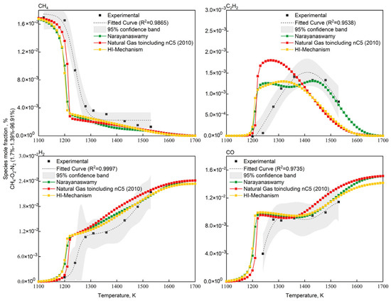 Validation of the HI-Mechanism was performed using Konnov’s lean CH4/O2/N2 systems [67] with mixtures: 1.7% CH4—1.39% O2—96.91% N2 (O2/CH4 molar ratio = 0.82) in adiabatic batch reactors. The validation data were selected based on the characteristic conditions of non-catalytic partial oxidation of natural gas, where methane is in excess with an O2/CH4 molar ratio below 1, to better represent actual industrial operating conditions. Consistent with Figure 5 methodology, Narayanaswamy and NG-nC5(2010) served as benchmarks. Figure 6 demonstrates the CH4/C2H2/H2/CO concentration evolution, showing both experimental measurements and three mechanism predictions. Figure 7 showed the quantitative assessment of predicted key species concentrations in the methane/oxygen mixture.