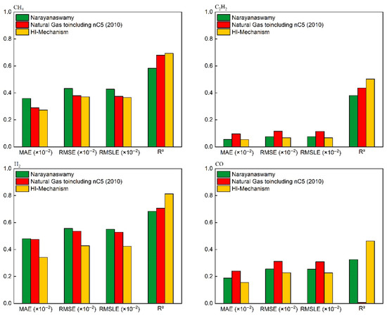 Quantitative performance evaluation of key species concentration predictions for CH4/O2 mixtures (comparison with experimental–simulation results in Figure 6).