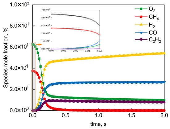 Simulated mole fraction profiles of reactants and products in CH4/O2 mixture under industrial conditions (O2/CH4 molar ratio = 0.60, atmospheric pressure).