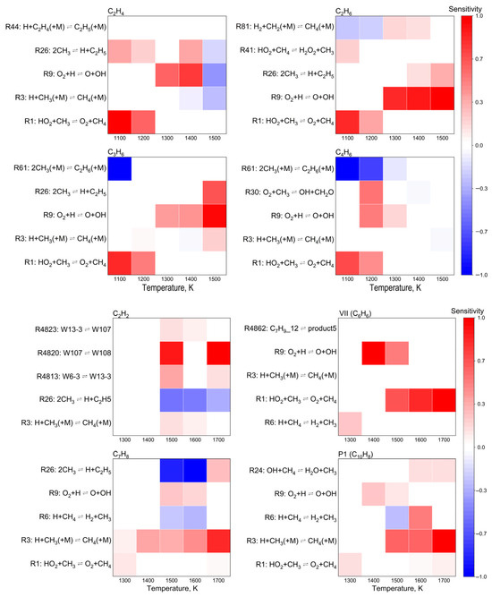 This study employed Chemkin-Pro to analyze the HI-Mechanism, focusing on product formation characteristics at 1 atm with O2/CH4 molar ratio 0.6. Figure 9 identifies optimal temperature ranges for C2H6, C2H4, C3H6, C4H6, C2H2, C6H6, C7H8 and C10H8 formation, showing distinct temperature dependencies between light hydrocarbons and aromatics. Figure 10 analyzes five key elementary reactions per product via normalized sensitivity coefficients (positive: enhancing, negative: inhibiting). Unimolecular reactions (dissociation/coupling) are governed by molecular collisions and energy transfer, while third-body (+M) reactions strongly depend on system pressure and local conditions [69,70].