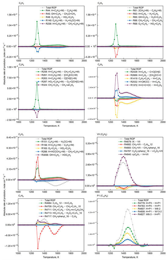 Figure 11 presents the absolute rate distributions of elementary reactions for target products (C2H4, C2H6, C3H6, C4H6, C2H2, C6H6, C7H8, C10H8) at different temperatures. Forward rates quantify formation kinetics, while negative rates reflect consumption pathways. Comparative analysis of rate distributions across temperatures identified dominant formation pathways and their temperature dependencies.
