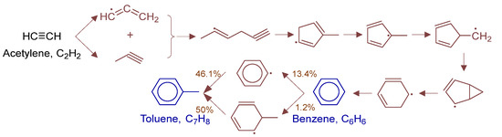 - Miller, J.A.; Klippenstein, S.J. The recombination of propargyl radicals and other reactions on a C6H6 potential. J. Phys. Chem. A 2003, 107, 7783–7799. [Google Scholar] [CrossRef]