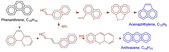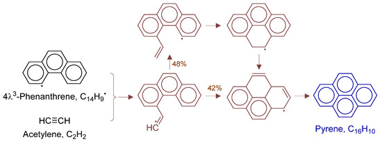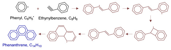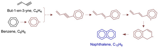 - Aguilera-Iparraguirre, J.; Klopper, W. Density functional theory study of the formation of naphthalene and phenanthrene from reactions of phenyl with vinyl- and phenylacetylene. J. Chem. Theory Comput. 2007, 3, 139–145. [Google Scholar] [CrossRef] [PubMed]
