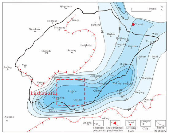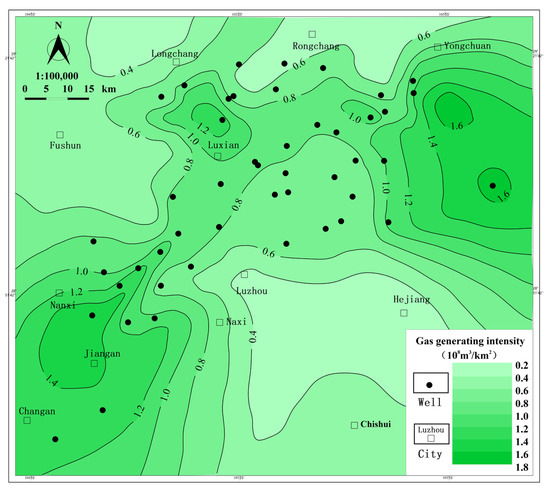 - The calculation results show that the total amount of gas generated in sub-layer 1 of Long11 in the Luzhou area was about 1.0 × 1012 m3, and the gas generation intensities were in the range of 0.4 × 108 m3/km2–1.6 × 108 m3/km2. In a comparison with the results obtained using other gas generation models, it was found that the accuracy of the gas generation estimation of the Longmaxi shale significantly improved.