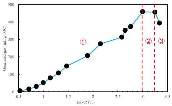 - The gas generation process of the Longmaxi shale included three stages: (a) the gases were generated quickly in the equivalent vitrinite reflectance (EqVRo) range of 0.5–3.0%; (b) the amount of gas generated was stable in the EqVRo range of 3.0–3.25%; and (c) the amount of gas generated decreased when EqVRo exceeded 3.25%.