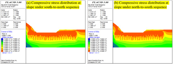 Following pillar extraction, the compressive stress distributions under four stope mining sequences (south-to-north, north-to-south, center-to-flank, and flank-to-center) are illustrated in Figure 11. Post-stope extraction, the stress redistribution zones expanded further. The compressive stress nephograms reveal no stress concentration in the open-pit slope or backfill isolation layer. The isolation layer primarily experienced gravitational stresses (0.04–2 MPa), which remained lower than those in the surrounding rock and insufficient to induce failure.