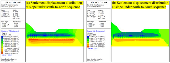 Figure 8 presents settlement displacement nephograms post-pillar mining. Mining sequences differentially influence the surrounding rock, backfill isolation layer, and slope in terms of impact magnitude and spatial extent. In terms of influence range, the south-to-north and flank-to-center mining sequences result in a broader affected area compared to the other two schemes. However, regarding the severity of the impact, these same sequences cause less disturbance.