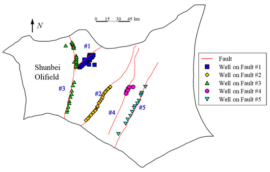 The SFT data used in this study were exclusively derived from well-logging temperature measurements collected from completed wells in the Shunbei Oilfield. Well-logging temperature data represents the closest approximation to SFT. Acquired through direct measurement of formations, this temperature reflects the collective influence of geological properties including terrestrial heat flow, geological structures, and lithology. Therefore, utilizing well log temperature data as the primary source for SFT enables models to inherently account for these multifaceted geological factors without the need for their separate analysis. The dataset comprises measurements from 113 wells, predominantly directional and horizontal wells, distributed across five different fault zones. These wells cover an area of approximately 230 170 , extending vertically to depths of up to 9 (as shown in Figure 2).