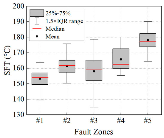 As shown in Table 1 and Figure 3, the 113 wells in the Shunbei Oilfield exhibit measured depths (MDs) predominantly ranging from 7000 m to 9000 m, with TVDs mostly falling within the same interval. BHTs generally range from approximately 135 °C to 200 °C across all fault zones. Table 1 summarizes the key characteristics of temperature logging data for each of the five fault zones. Among them, fault zone #5 contains the wells with the greatest MD (9272.50 m) and the highest recorded SFT (199.06 °C), while fault zone #2 includes the well with the shallowest MD (6977.63 m). In total, the dataset comprises more than 5.1 million SFT data points. Figure 3 displays the distribution of SFT values for each fault zone using box plots. The gray boxes indicate the interquartile range (IQR), covering the middle 50% of the data (i.e., 25% to 75%), and the whiskers extend to 1.5 times the IQR, typically encompassing the entire range of observed temperatures. This visual representation highlights the spatial heterogeneity of SFT distributions across different structural zones, reflecting both localized thermal anomalies and regional geothermal gradients within the study area.