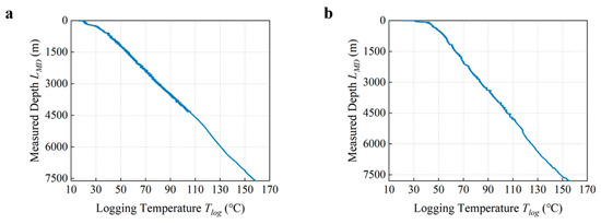 Full-borehole logging temperature data of two wells: (a) well from fault #4; (b) well from fault #5.