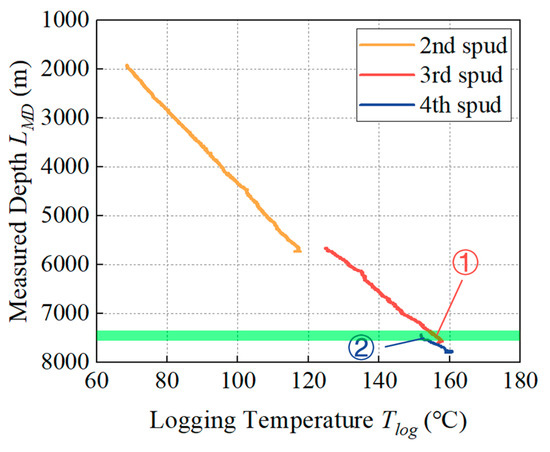 Second, the SFT logging data were collected over multiple logging runs during the drilling process. Due to differences in logging conditions and instrument calibration across runs, temperatures measured at identical depths may vary, resulting in discontinuities and overlapping segments within the whole temperature profile. To ensure data consistency and continuity, measurements from the most recent logging runs are retained, while earlier overlapping data are discarded. This preprocessing approach is illustrated in Figure 5, where within the green-shaded region, line ① is removed, and line ② is preserved to construct a coherent temperature profile.