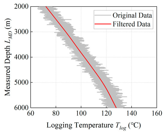 During logging operations, certain well logs exhibit significant data fluctuations due to measurement-related factors, as illustrated in Figure 6. While such raw data cannot be directly utilized, the underlying trend with depth retains the characteristic pattern of formation temperature variation. Consequently, these datasets require filtering before application. The red line in Figure 6 represents the filtered data applied to the model.