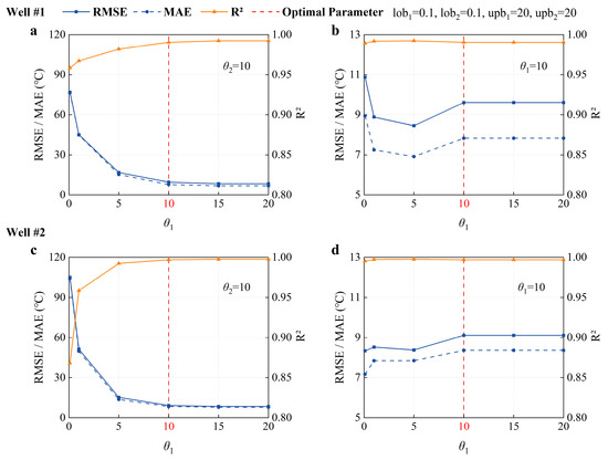 Sensitivity analysis of θ on model performance: (a) θ1 of well #1; (b) θ2 of well #1; (c) θ1 of well #2; and (d) θ2 of well #2.