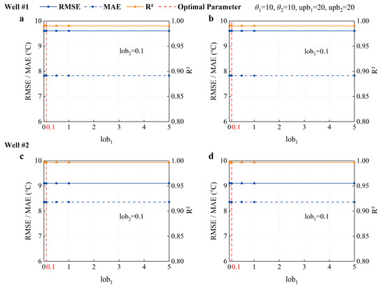 Effect of lower bound (lob) on Kriging model accuracy: (a) lob1 of well #1; (b) lob2 of well #1; (c) lob1 of well #2; and (d) lob2 of well #2.