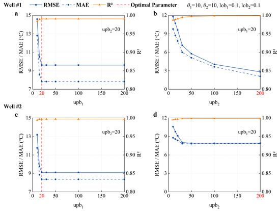Effect of upper bound (upb) on Kriging model accuracy: (a) upb1 of well #1; (b) upb2 of well #1; (c) upb1 of well #2; and (d) upb2 of well #2.