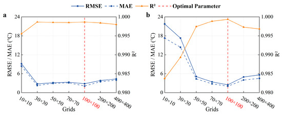 As shown in Figure 10, the variation in prediction accuracy with respect to grid resolution exhibited a similar trend across both wells. Initially, increasing the number of grid cells led to a rapid improvement in accuracy. However, beyond a certain point, further refinement resulted in diminishing returns and even a slight degradation in performance. This was attributed to oversmoothing and overfitting effects introduced by excessive grid refinement. Conversely, overly coarse grids caused excessive spatial averaging, masking local temperature variations, and reducing model fidelity.