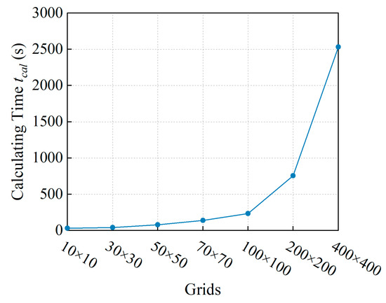 Computation time (tcal) serves as a crucial metric for identifying the optimal grid configuration. As illustrated in Figure 11, the computational time increases significantly with the number of grid cells. However, beyond a grid size of 100 × 100, the extended computation time does not yield improved accuracy. Considering both prediction accuracy and computational cost, the 100 × 100 grid resolution was identified as the optimal configuration. This resolution provides a balance between adequate spatial detail and computational efficiency, and was thus adopted as the standard grid setup for all subsequent Kriging-based SFT predictions in this study.