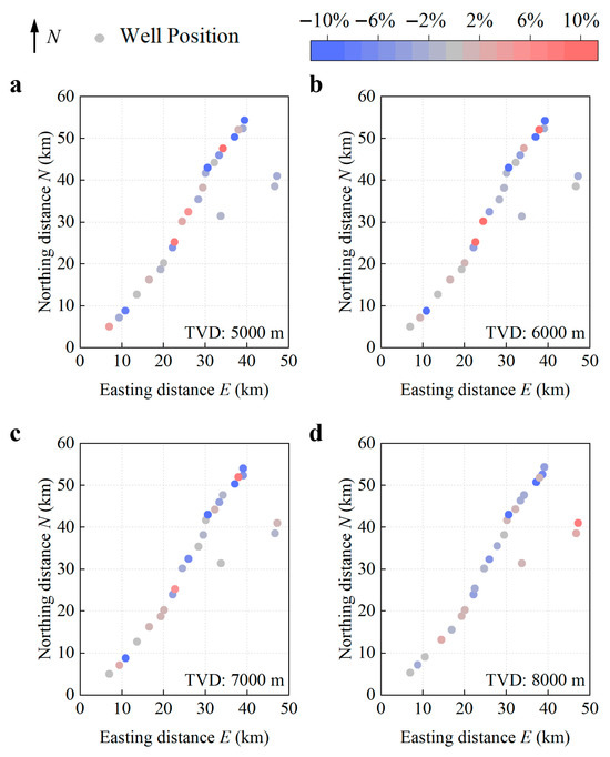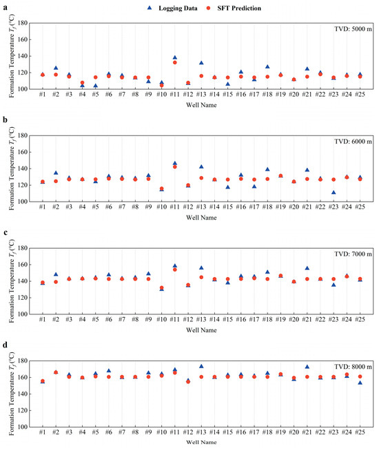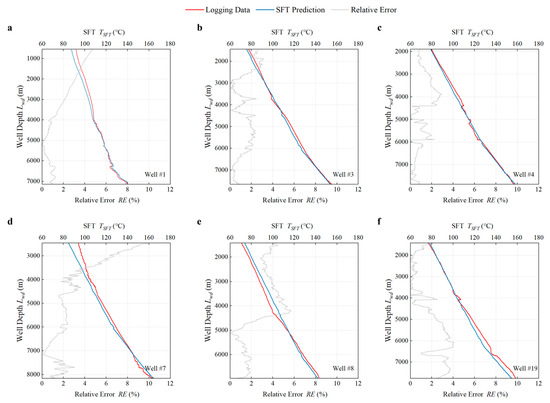 As shown in Figure 12, the Kriging-predicted SFT profiles closely match the overall trend of the measured temperature data throughout the entire depth range. In these two wells, the predicted temperature exhibits a consistent increase with depth, and the relative prediction error is basically below 5%. Minor deviations observed at shallow and deep sections of certain wells are attributed to either limited nearby data density or localized thermal anomalies not fully captured by the regional interpolation model. Nevertheless, the close alignment between measured and predicted values demonstrates the robustness and spatial adaptability of the proposed Kriging framework.