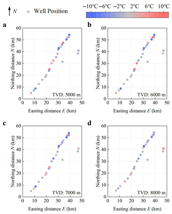 The SFT was originally measured at discrete points with an MD interval of 0.125 . To enable the practical application of Kriging interpolation, the data were resampled to a uniform spacing of 1 along TVD, thereby achieving a vertical resolution of 1 . In contrast, the horizontal resolution remains relatively coarse due to the wide spacing between wells. Given the optimal drainage area required for oil and gas production, the horizontal distance between wells typically ranges from several hundred meters to several kilometers, which limits the lateral spatial density of the temperature dataset.