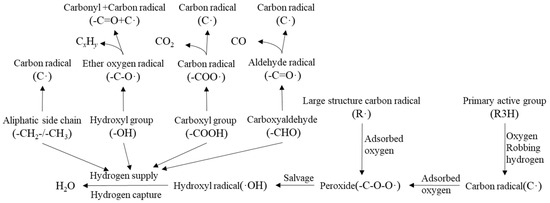 Coal is a porous solid-phase medium with a well-developed surface pore structure, which can adsorb gas molecules such as oxygen and methane and is prone to spontaneous combustion [15,16]. As early as the 17th century, scholars have put forward the pyrite causation theory, bacterial causation theory, phenol-based interaction theory and coal–oxygen complex interaction theory, through different research angles, to explain the mechanism of CSC. The widely recognized coal–oxygen complex theory holds that the interaction between coal and oxygen is the fundamental cause of CSC. The spontaneous combustion of coal is mainly caused by the coal–oxygen composite effect and the release of heat. At normal temperature, coal bodies successively combine oxygen in the air through physical adsorption and chemical adsorption, generating low-temperature oxidation, releasing a small amount of heat and producing primary oxidation products. The chemical reaction and product relationship of CSC are shown in Figure 1 [17,18]. Due to the lack of effective heat dissipation, the accumulation of heat once again promotes the oxidation of the coal body. When the temperature of the coal body exceeds the critical temperature, it accelerates the vicious cycle of oxidation–heat release–temperature rise, eventually leading to the spontaneous combustion of the coal body [19,20]. The essence of CSC is that coal comes into contact with oxygen in the air and undergoes an oxidation reaction. When the stored heat is greater than the heat dissipation, the heat continuously accumulates and reaches the ignition point of the coal, thus causing spontaneous combustion [21].