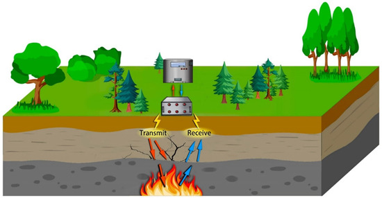 4. The geological radar detection method: Georadar can effectively detect the distribution of underground media. This technology relies on powerful pulses of electromagnetic waves emitted by transmitters to pinpoint deep rock structures. When the electromagnetic wave signal is transmitted to the underground detection target, a reflection occurs, and the receiver receives the two signals and amplifies them and displays them by the oscilloscope [63]. Geological radar detection is based on the characteristics of the electromagnetic wave source strength and propagation rate in different temperature media, and the collected reflected signal is processed, the form of underground CSC space is analyzed, and the fire area is delineated. Its working principle is shown in Figure 2. Ma et al. [64] carried out research in a Gongwusu open-pit coal mine in Wuhai City, Inner Mongolia. Based on the correlation analysis of coal seam resistivity and temperature, geological radar and conical transient electromagnetic methods were used to detect the ignition point and fire zone range of CSC and effectively identify the location of the potential natural ignition point and fire range. Gao et al. [65] proposed a deep learning-based coal fire ground-penetrating radar identification method based on the images obtained by scanning the physical model of coal fire with radar based on a deep learning algorithm. This method has the characteristics of extremely high accuracy and rapidity in identifying coal field fire areas. However, some scholars have found through a series of experiments that the intensity of electromagnetic waves will attenuate with the increase in depth. And under the condition of a certain depth, the energy of electromagnetic waves usually decreases as the water content increases [66].