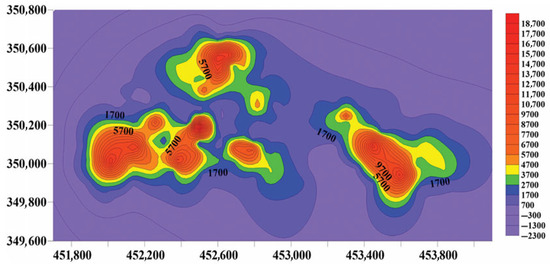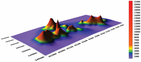 1. The radon measurement method: A radioactive radon element with strong migration ability exists widely in nature and is often used as a tracer. When a coal field fire occurs, the underground temperature and pressure increase, forming negative pressure with the surface. Radon in the ground soil, along with other gases such as water vapor and carbon monoxide produced by combustion, moves in the cracks in the top space of the CSC area along with the temperature gradient and pressure gradient and constantly precipitates to the surface, and then by embedding α detection cups in the soil to collect radon ions released from the surface and by analyzing and comparing the radon values in the detection cups, abnormal areas can be determined [84]. The radon measurement method is an effective method for exploring the location of shallow-buried coal seam fire areas at present. It has developed relatively maturely and is less affected by the environment. However, this method is easily affected by geological structures such as surface fissures during the detection of deep-buried coal seam fire areas. Usually, when combined with other methods, it can achieve good detection results. Chan et al. [85] studied the long-distance migration rule of radon during the spontaneous combustion of coal, covering a specific abandoned fire area, by using the methods of laboratory experiments and numerical simulation and obtained the mathematical relationship between the exhaled concentration of radon and the spontaneous combustion temperature of coal through nonlinear fitting. Based on the theoretical foundation of the radon measurement and magnetic detection, Hu et al. [86] proposed the detection principle of the “radon–magnetic” combined technology, successfully delineated an acquisition area of 213 square meters, and completed the treatment of the fire zone through the method of drilling and grouting. Tan et al. [87] conducted a study, and based on the infrared thermal imaging data of Mine No. 1 in the Fukang mining area, combined with an on-site inspection of the radon measurement method, the borehole temperature measurement was further verified, and the high-temperature fire source point was successfully determined by analyzing the abnormal emission point of radon concentration, providing a basis for the development of a fire extinguishing plan in the Fukang Coal Mine. Duan et al. [88] proposed a new method to increase the number of single gas sampling points and expand the single detection range in the process of radon element measurements, which improved the detection efficiency by reducing the number of measurement points, and based on the measurement results, through simulation, the radon concentration distribution map of the research area in the detection area as shown in Figure 3 and the three-dimensional diagram of the abnormal radon value as shown in Figure 4 were obtained. From the figures, the magnitude of the abnormal radon value can be clearly seen and the potential location of the underground fire source can be determined.